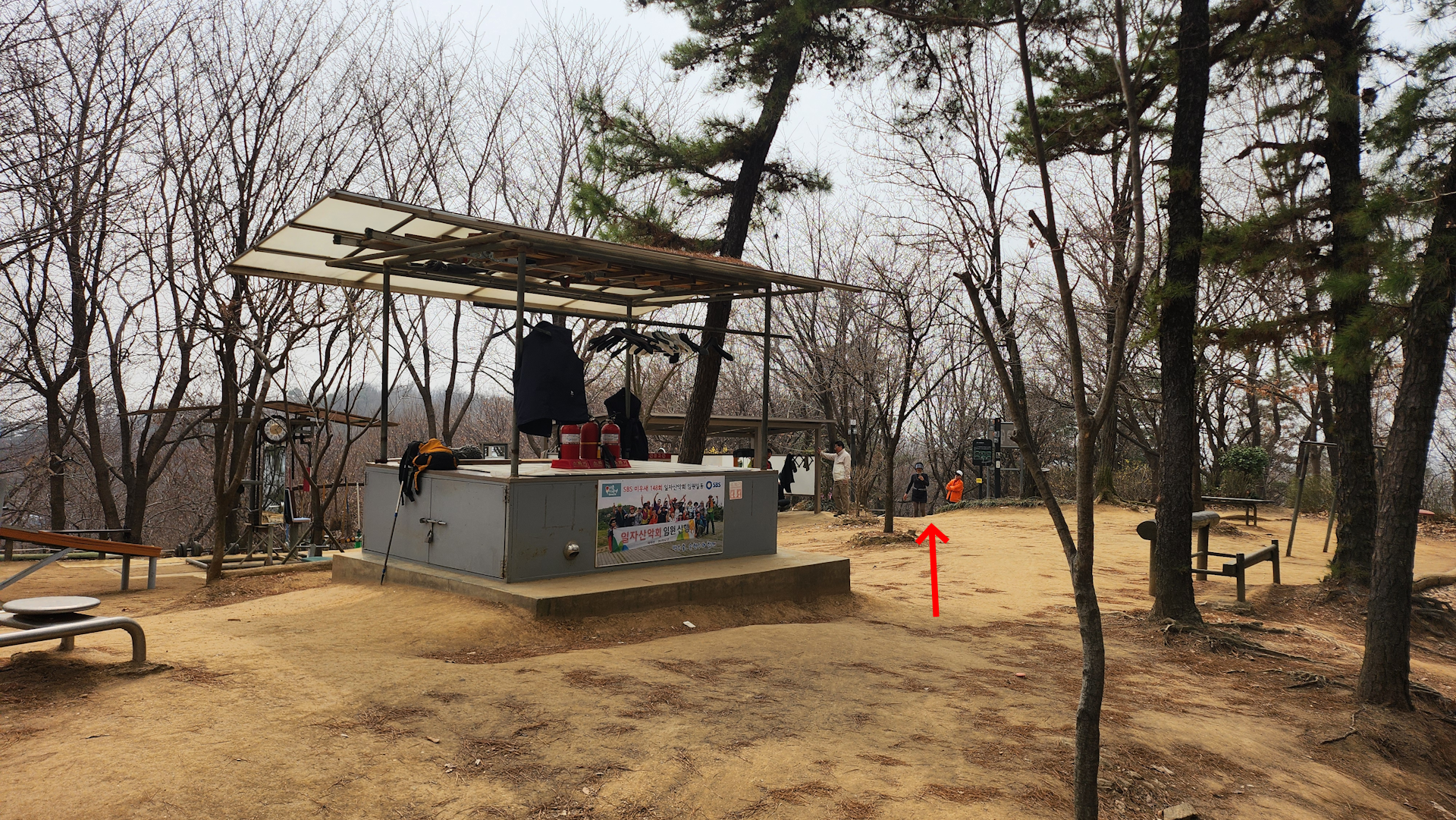 오르막을 다 올라오면 운동시설이 보입니다. 운동시설을 가로질러서 반대편 내리막으로 들어갑니다.