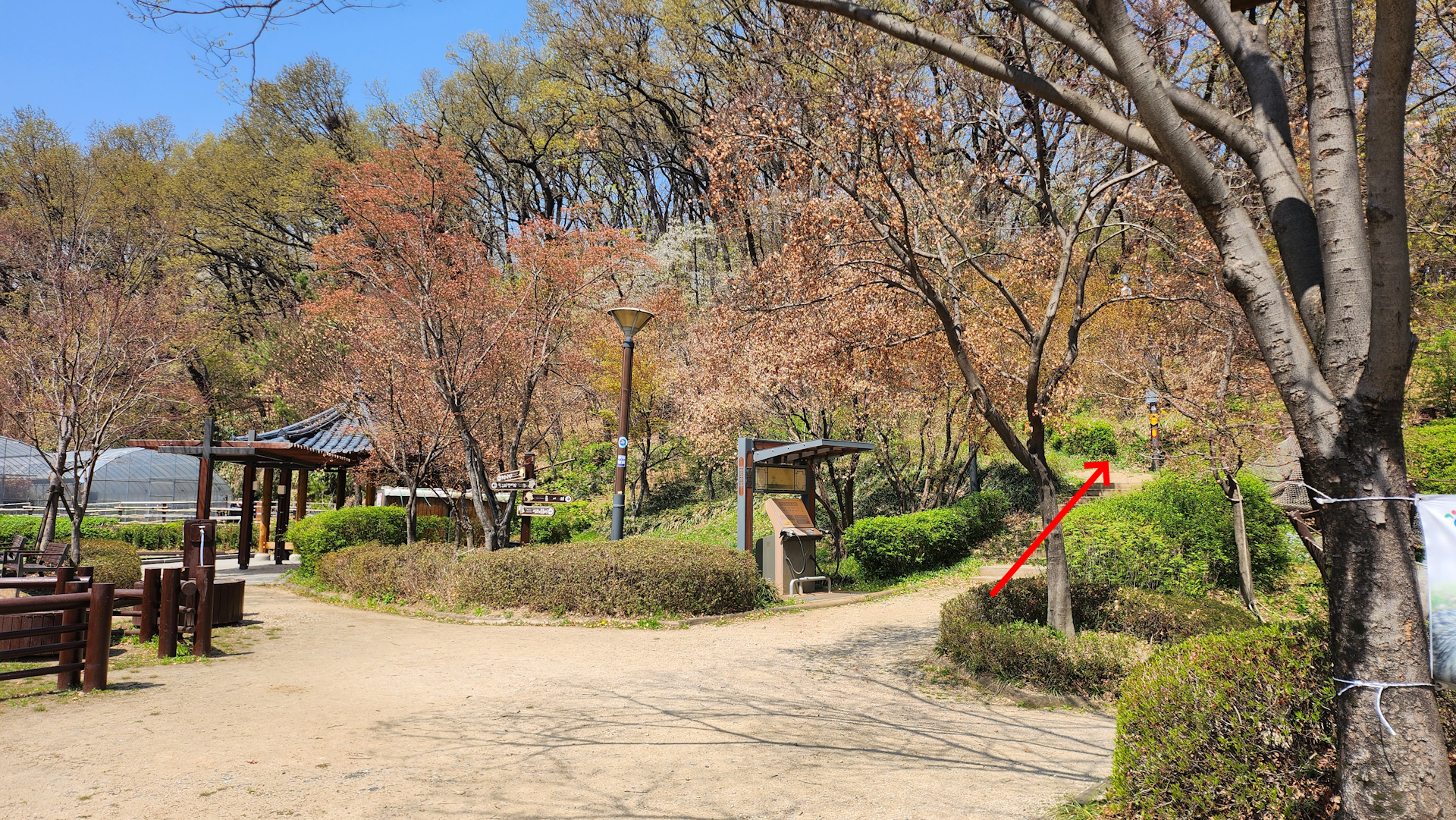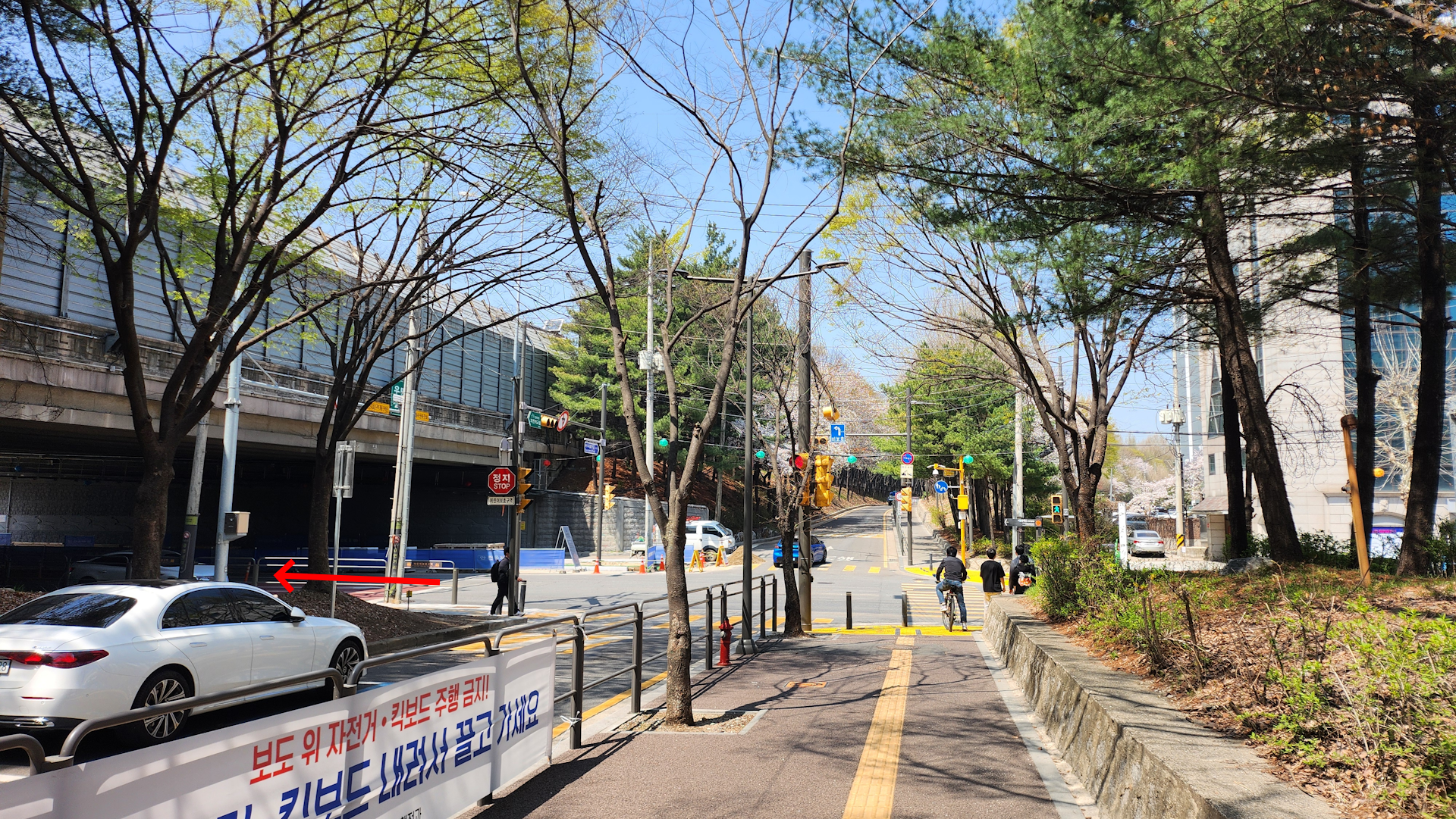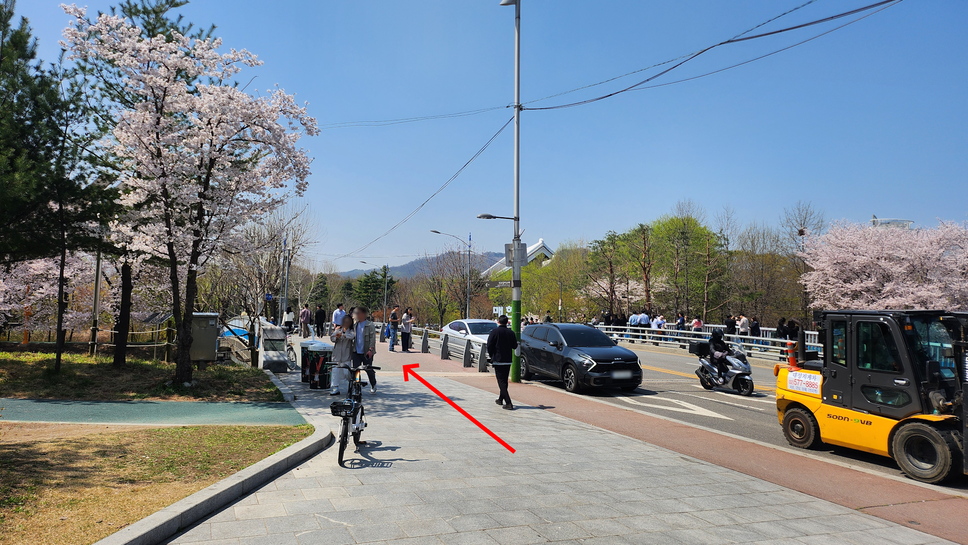 길을 따라 가다보면 공원을 나오는 길이 보이는데 여기서 왼쪽으로 나간 후 오른쪽으로 이동합니다.