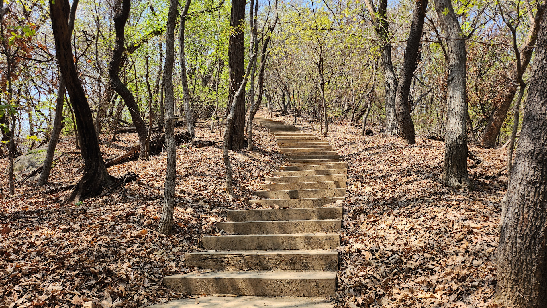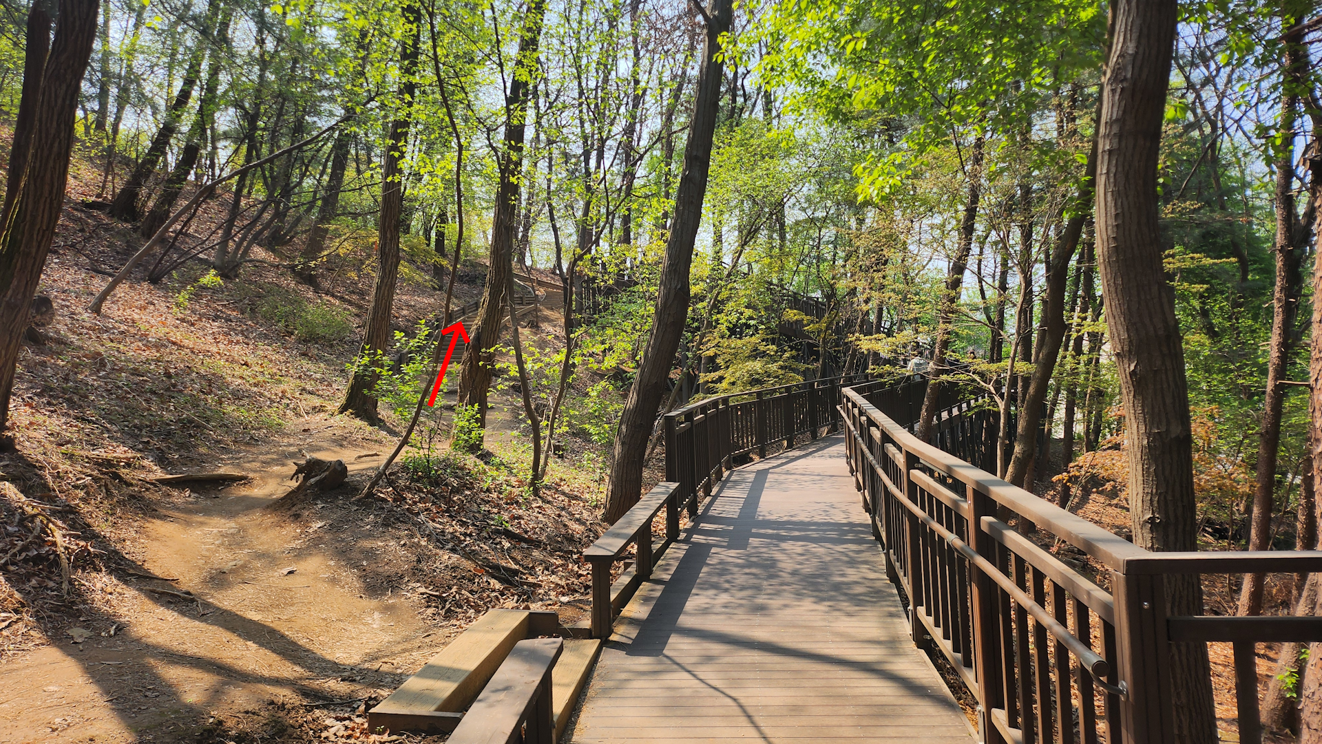 이후에 산길과 데크길을 반복하다가 사진과 같은 갈림길을 만나면 계단으로 올라갑니다.