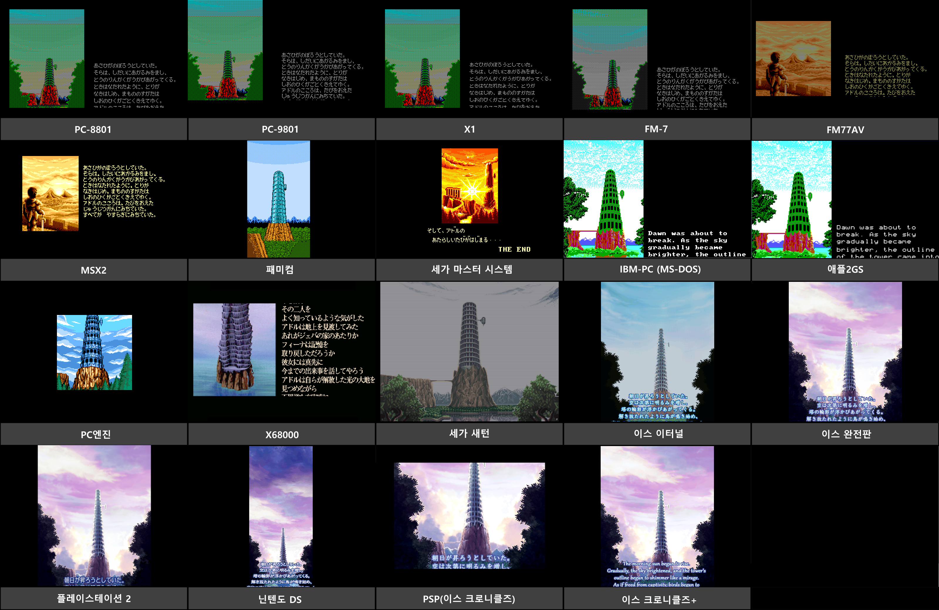 예외로 FM77AV, MSX2 판은 탑 정상에 서있는 아돌을 보여주는 새로운 비주얼로 바뀌었고