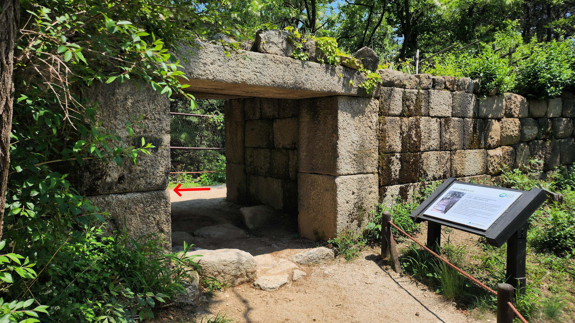 오르막을 조금 오른 후에 보이는 성벽 문을 지나고 왼쪽으로 들어갑니다.