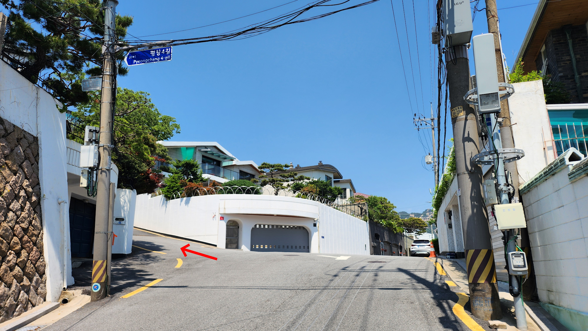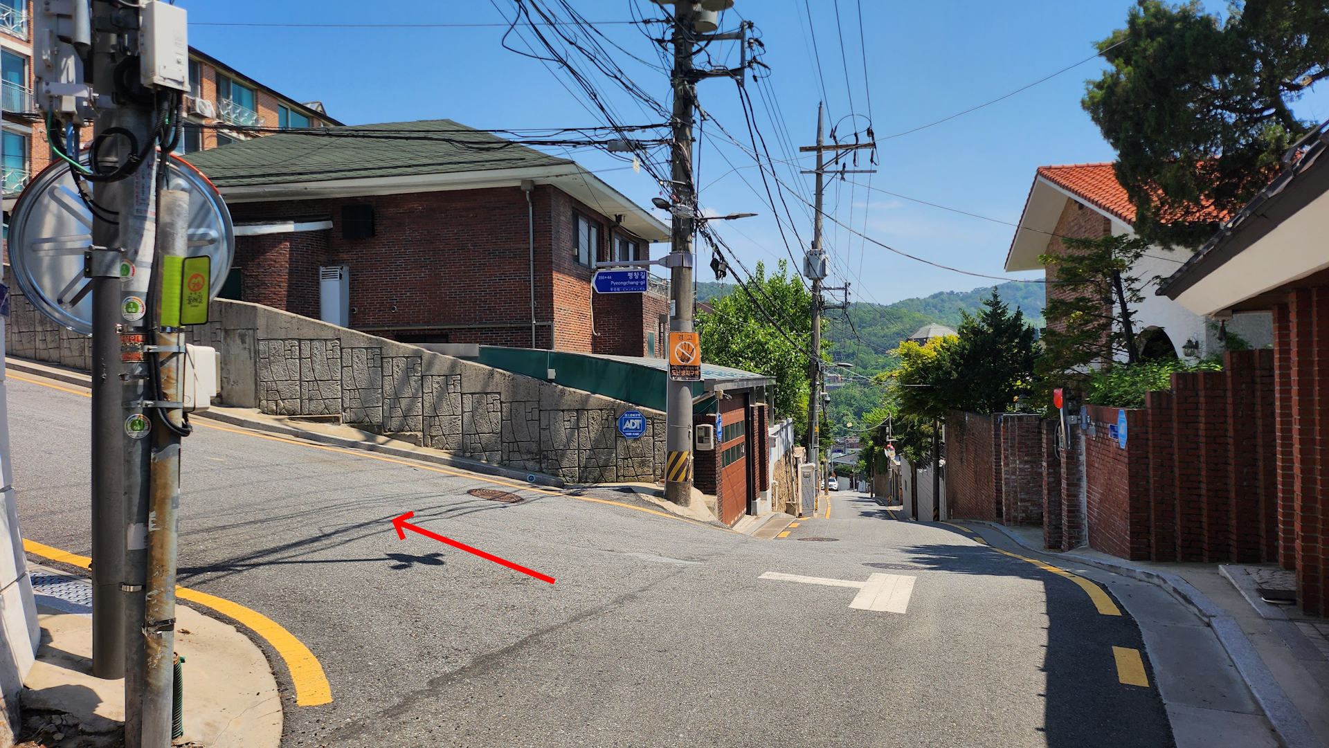 계속 올라가다 보면 포장도로를 만납니다. 여기부터 평창마을 주택가 구간입니다.