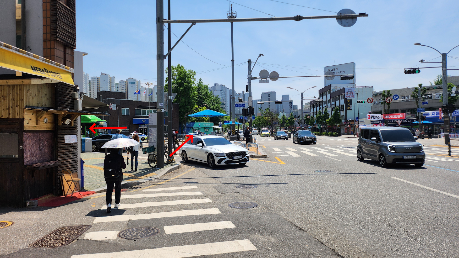 사진 정면에 보이는 교차로는 왼쪽으로 조금 우회해서 나오는 건널목을 건너가야 합니다.