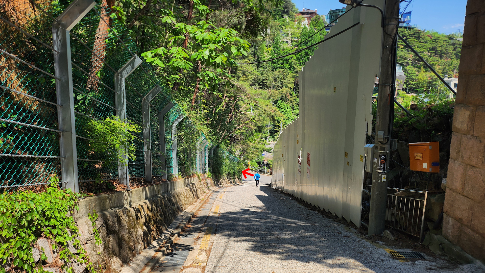 내리막이 끝나면 왼쪽으로 간 후에 계속 큰 길만 따라가면 종착지까지 갈 수 있습니다.