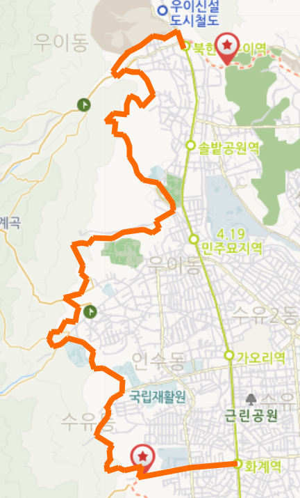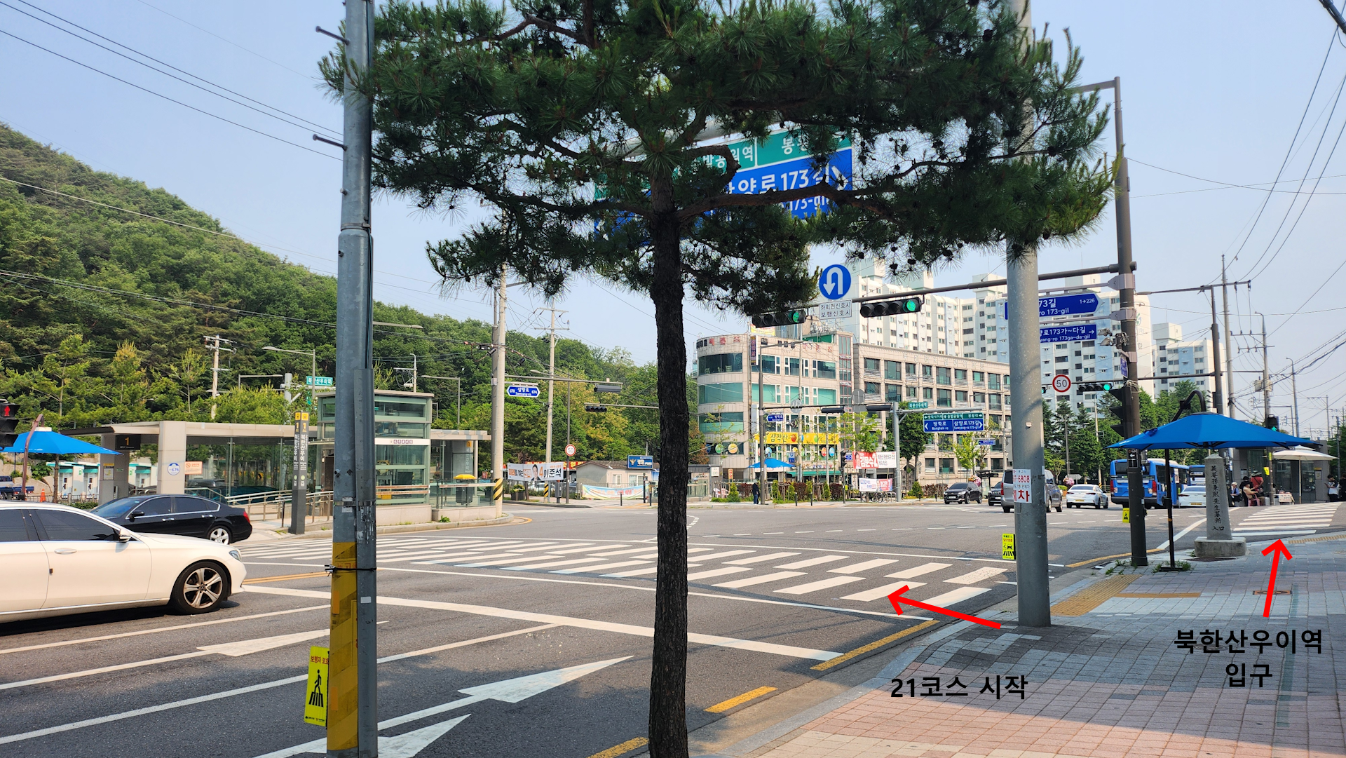 큰 도로가 보이면 이번 코스도 거의 끝입니다. 왼쪽으로 가면 북한산우이역에 도착합니다.
