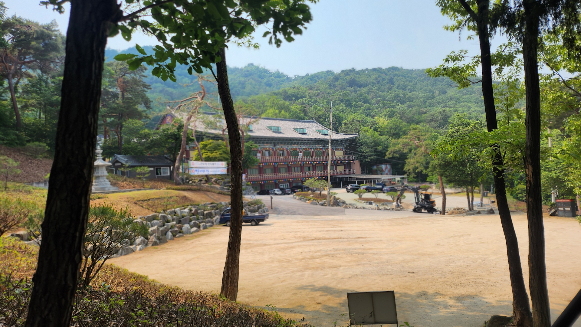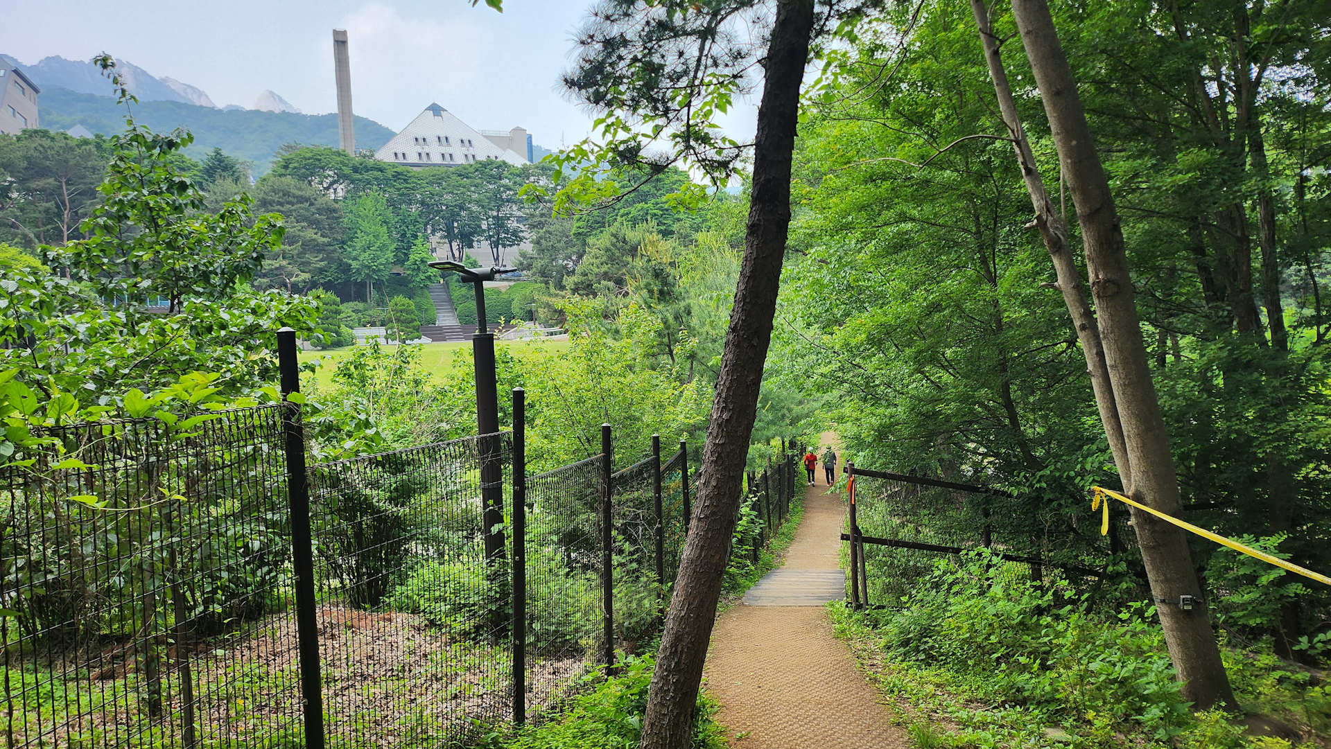 바로 왼쪽에 보이는 공터와 특이한 세모지붕 건물이 국립통일교육원입니다.
